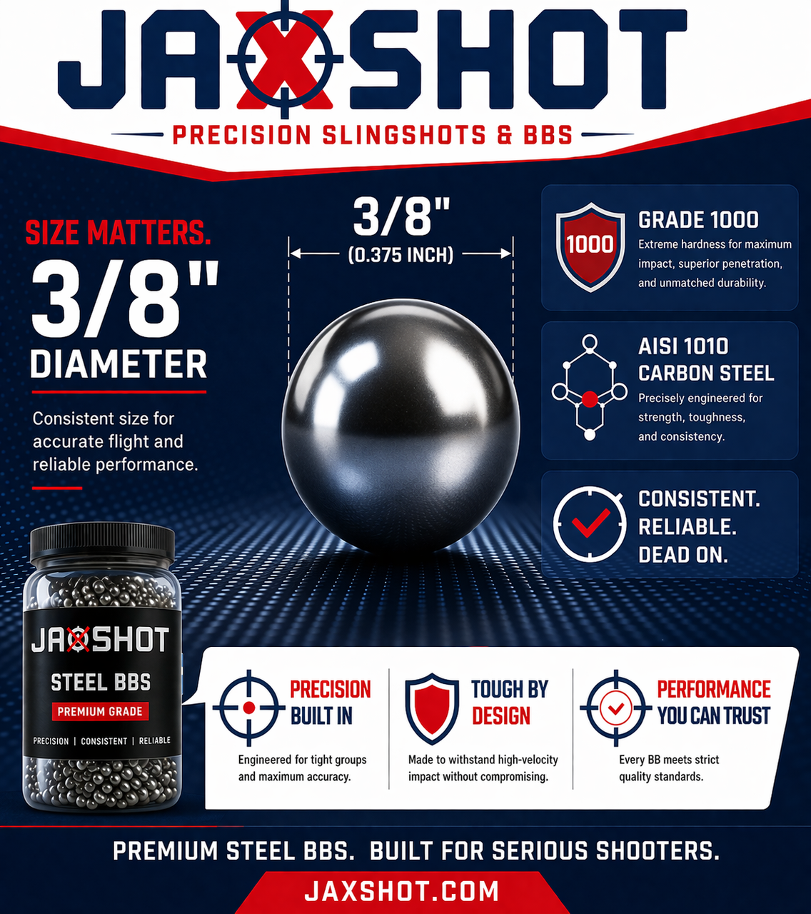 JAXSHOT is the newest brand from BC Precision, built on years of experience delivering high-quality precision balls and ammunition. Created specifically for slingshot and BB shooting enthusiasts, JAXSHOT products are engineered for consistent size, reliable performance, and serious durability. You get the same trusted precision, now under a brand focused entirely on performance shooting.